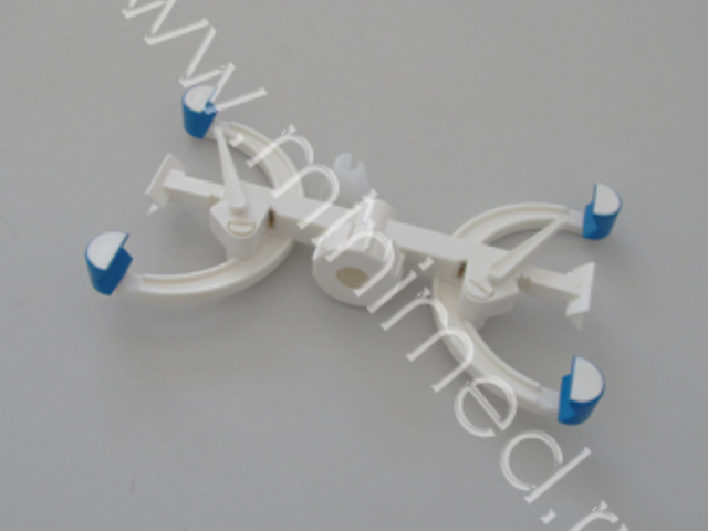 Предназначен для закрепления бюреток на ШФР. Основная насадка с двумя сменными уплотнителями, благодаря которым зажим может фиксироваться на штативах диаметром 8-14 мм. Центральная лапка с пружиной плотно удерживает бюретку, упирающуюся в две другие лапки. После установки шкала бюретки полностью открыта, мениск и градуировка видны на всем протяжении. Изготовлен из АБС - пластика, муфта- из ПВХ.