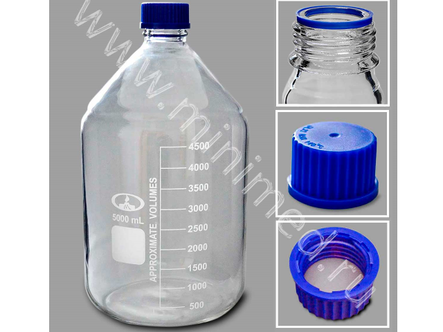 Предназначена для хранения химических реактивов. Изготовлена из химико-лабораторного стекла, крышка изготовлена из полипропилена. На горлышке есть уплотнительное кольцо. Градуированы до 4,5 л.