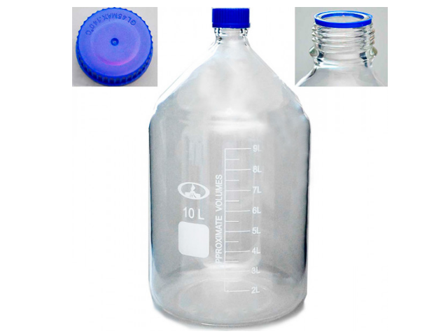 Предназначена для хранения химических реактивов. Изготовлена из химико-лабораторного стекла, крышка изготовлена из полипропилена. На горлышке есть уплотнительное кольцо. Градуированы до 9 л.