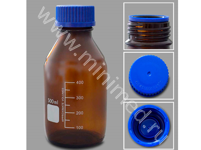 Предназначена для хранения химических реактивов. Изготовлена из янтарного (темного) химико-лабораторного стекла, крышка изготовлена из полипропилена. На горлышке есть уплотнительное кольцо. Градуированы до 400 мл.