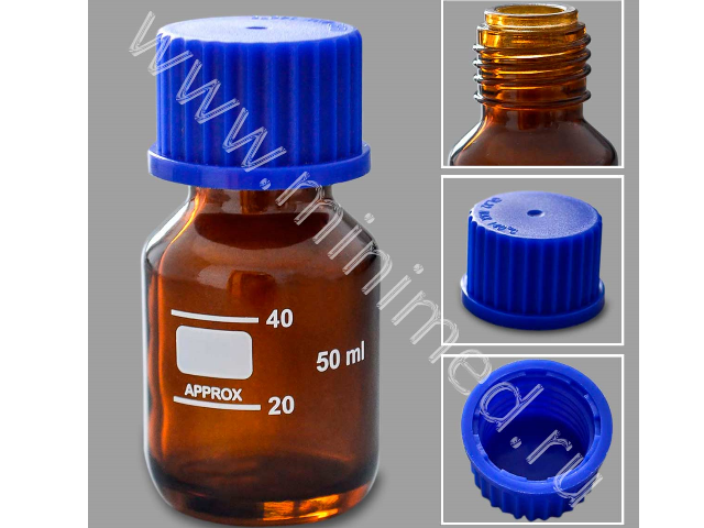 Предназначена для хранения химических реактивов. Изготовлена из янтарного (темного) химико-лабораторного стекла, крышка изготовлена из полипропилена. На горлышке есть уплотнительное кольцо. Градуированы до 40 мл.