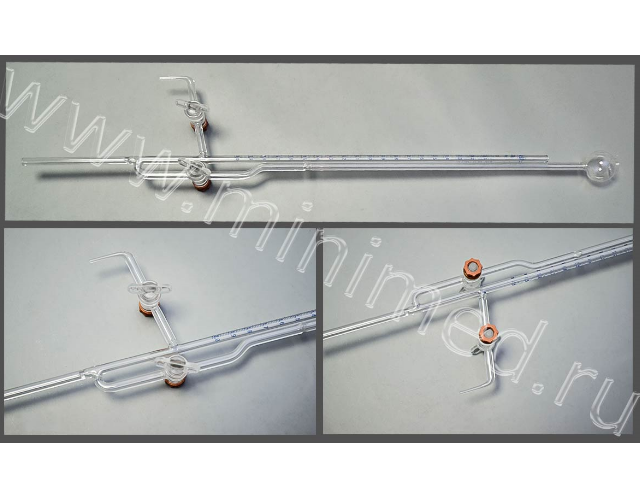 Микробюретка предназначена для титрования и отмеривания небольших количеств жидкости (на объем 1-5 мл). Имеет конусные стеклянные одноходовые пришлифованные краны с резьбовым уплотнением и резервуар для удобства дозаполнения жидкостью.