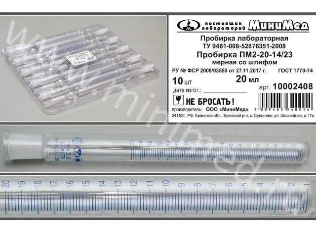 Пробирка лабораторная по ТУ 9461-008-52876351-2008, мерная со шлифом, ПМ2-20-14/23, ГОСТ-1770-74, уп. 10 шт