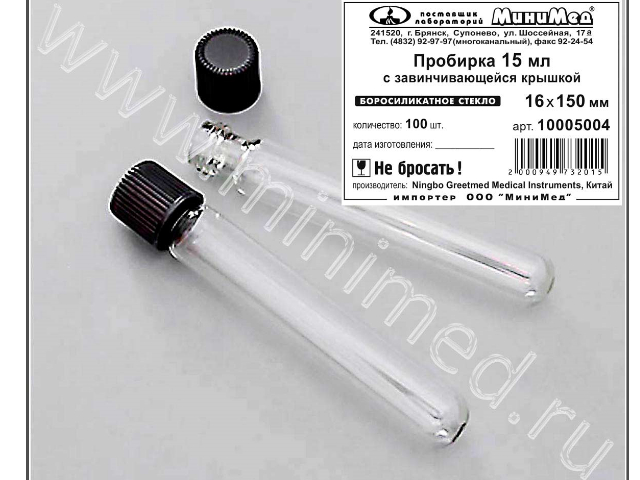 Пробирка с завинчивающейся крышкой разработана для химических, биологических и микробиологических лабораторных процедур. Изготовлена из боросиликатного стекла, крышка из бакелита выдерживает t до 300 град.
