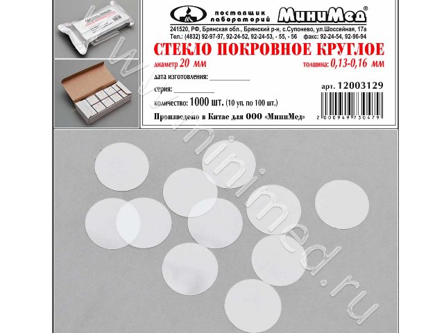 Стекло покровное круглое диам.20 мм,толщ.0,13-0,16 мм, уп.1000 шт.