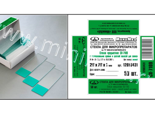 Стекло для микропрепаратов по ТУ 9464-012-52876859-2014, предметное СП-7109, с полиров. краями и зелёной полосой, 26*76 мм, толщ.1,0 мм, уп. 50 шт/2500 шт