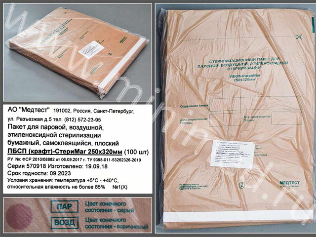 Пакет для паровой, воздушной, этиленоксидной стерилизации бумажный (крафт) самоклеящийся плоский ПБСП-СтериМаг 250*320, уп.100шт