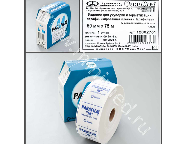 Изделие для укупорки и герметизации: парафинизированная пленка "Парафильм" подходит для любых контейнеров. Состоит из полиолефинов и парафиновых восков. Может растягиваться до 200% и закрывать углы и неровные поверхности, обеспечивая герметичность даже в случае случайного падения контейнера. Не содержит пластификаторы и латекс. Пленка устойчива на протяжении 48 часов к воздействию многих полярных реактивов: растворы солей, неорганические кислоты и щелочные растворы. По истечении 48 часов пленка может стать хрупкой.