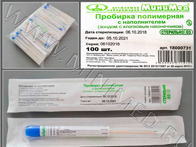 Предназначен для взятия и хранения образцов биологического материала с целью безопасной транспортировки в лабораторию для проведения анализа. Удобен для взятия смывов, в том числе санитарных. Стерильный. Тампон-зонд упакован в ударопрочную ПП-пробирку (12*150 мм). Пробирка снабжена этикеткой, на которой указаны: номер партии, дата стерилизации, срок годности, компания-производитель, компания-поставщик, регистрационное удостоверение, а также предусматривает место для нанесения сведений о пациенте и пробе. Край этикетки скреплен с пробкой, закрывающей пробирку с тампоном - этикетка служит контролем первого вскрытия.