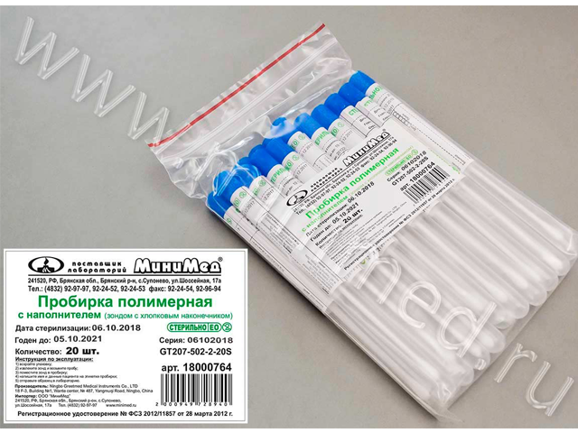 Пробирка полимерная с наполнителем (пластиковым зондом с хлопковым наконечником), стерильно, 20 /200/2000 шт