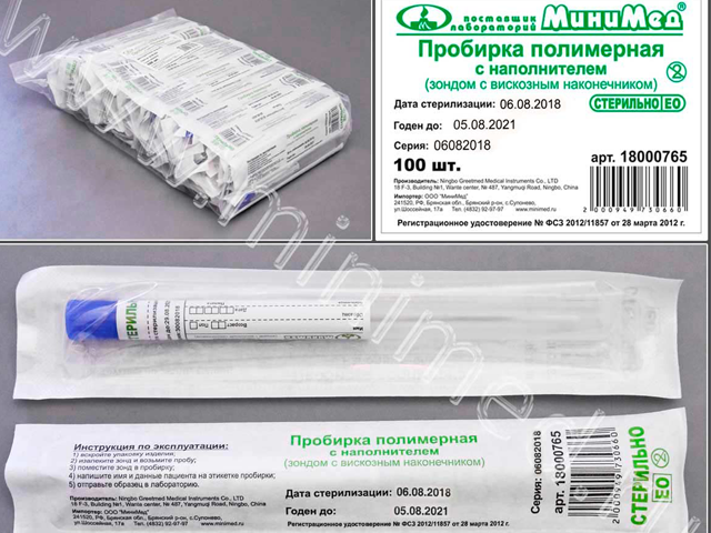 Предназначен для взятия и хранения образцов биологического материала с целью безопасной транспортировки в лабораторию для проведения анализа. Удобен для взятия смывов, в том числе санитарных. Стерильный. Тампон-зонд упакован в ударопрочную ПП-пробирку (12*150 мм). Пробирка снабжена этикеткой, на которой указаны: номер партии, дата стерилизации, срок годности, компания-производитель, компания-поставщик, регистрационное удостоверение, а также предусматривает место для нанесения сведений о пациенте и пробе. Край этикетки скреплен с пробкой, закрывающей пробирку с тампоном - этикетка служит контролем первого вскрытия.