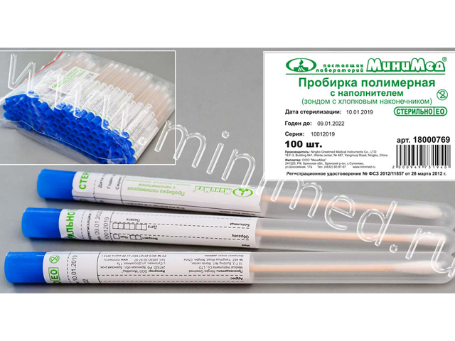 Предназначен для взятия и хранения образцов биологического материала с целью безопасной транспортировки в лабораторию для проведения анализа. Удобен для взятия смывов, в том числе санитарных. Стерильный. Тампон-зонд упакован в ударопрочную ПП-пробирку (12*150 мм). Пробирка снабжена этикеткой, на которой указаны: номер партии, дата стерилизации, срок годности, компания-производитель, компания-поставщик, регистрационное удостоверение, а также предусматривает место для нанесения сведений о пациенте и пробе. Край этикетки скреплен с пробкой, закрывающей пробирку с тампоном - этикетка служит контролем первого вскрытия.