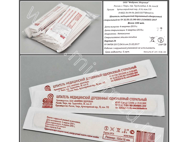 Шпатель медицинский деревянный стерильный, инд.уп.,150*18*1,8 мм, уп.100шт