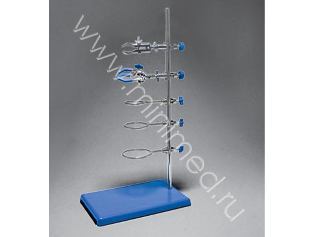 Состоит из вертикального стержня на прямоугольном основании, двух лапок (2-х палая и 3-х палая), трех колец. Изготовлен из металлических сплавов. Соответствующие поверхности штатива хромированы или окрашены.