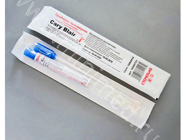 Транспортная среда Кери Блейр представляет собой модификацию базовой транспортной среды Стюарта, предназначенную специально для транспортировки и хранения фекальных и ректальных проб, содержащих Salmonella spp., Shigella spp., Vibrio spp., Campylobacter spp., Pseudomonas spp., Escherichia coli и другие микроорганизмы. Данная среда является стандартной для транспортировки анаэробов. Бактериальные культуры гарантированно сохраняют жизнеспособность до 48 часов при температуре 15-22°С. Тампон-зонд упакован в ударопрочную ПП-пробирку (12*150 мм). Пробирка снабжена этикеткой, на которой указаны: номер партии, дата стерилизации, срок годности, компания-производитель, компания-поставщик, регистрационное удостоверение, а также предусматривает место для нанесения сведений о пациенте и пробе. Край этикетки скреплен с пробкой, закрывающей пробирку с тампоном - этикетка служит контролем первого вскрытия.