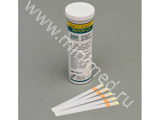 Полоски предназначены для экспресс-анализа содержания белка (альбумина) и уровня кислотности (рН) в моче человека. Индикаторный элемент полосок БИОСКАН-Белок содержит кислый буфер и специфический индикатор, который в присутствии белка изменяет цвет от желтого до зеленовато-синего. Индикаторный элемент на белок высокочувствителен к альбумину и гораздо менее чувствителен к другим белкам — глобулинам, пептонам, мукопротеинам, белкам Бенс-Джонса. Это означает, что отрицательный результат анализа не исключает наличия этих белков. Индикаторный элемент, предназначенный для анализа рН, содержит композицию из двух индикаторов, которая окрашивает элемент от оранжевого до синего цвета в физиологическом диапазоне значений кислотности мочи.Полоски могут быть использованы при массовых обследованиях здоровья населения, при обычных анализах мочи в клиниках и поликлиниках. Полоски могут применяться как медицинским персоналом, так и самими пациентами в порядке самоконтроля.